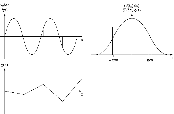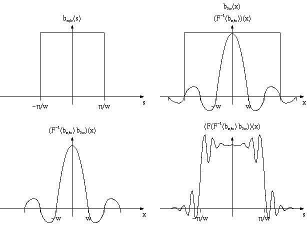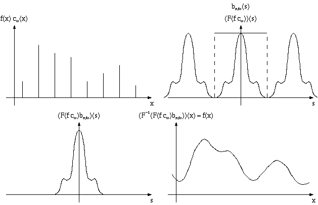 Multiplying the sampled spectrum point-by-point with the box filter bpi/w will extract the original spectrum from the sampled version; then we only have to calculate the inverse Fourier transform of the box-filtered spectrum, and, if we did in fact sample above the Nyquist rate, this will exactly reconstruct f, see Figure 9.