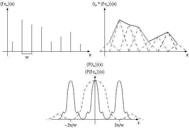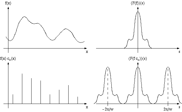 Sampling a function f(x) on a regular grid means representing the continuous function by a discrete set of function values f(x1), f(x2), f(x3), ... If all pairs of adjacent sample position are a distance w apart, this can be expressed by multiplying f pointwise with a comb function cw, see Figure 5.
