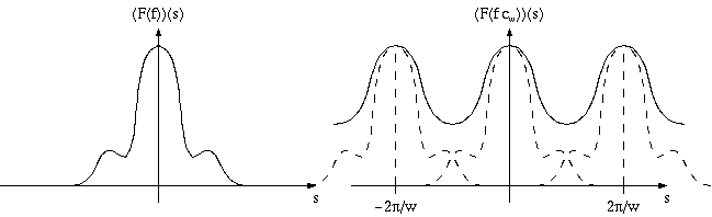 | Figure 6: A function f and its Fourier transform F(f). After sampling, the spectrum F(f) is replicated infinitely often in both directions. |