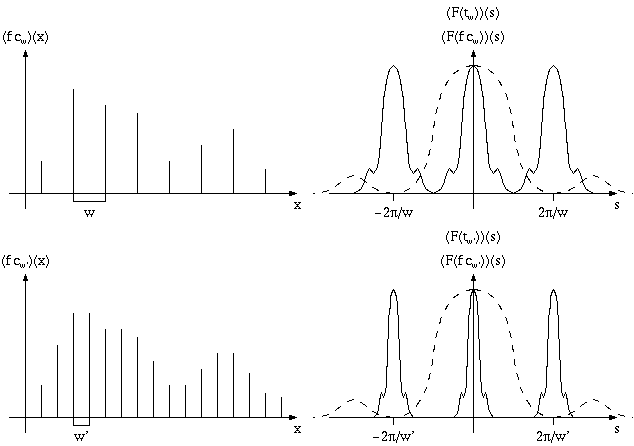 | Figure 3: The Fourier transform of a comb function cw is a scaled comb function cw', where w' = 2*pi/w. |