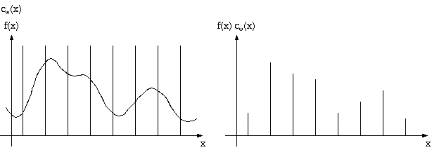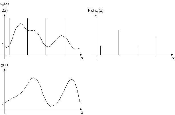 | Figure 5: A function f is sampled by multiplying it with a comb function cw. The result of sampling is a (discrete) sum of scaled Dirac impulses, which can be represented by a discrete set of weights - the sampled data set. |